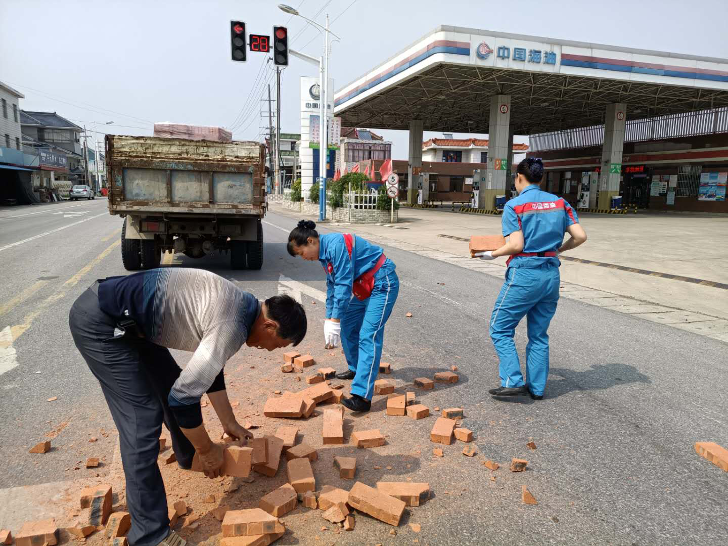 夏天的中午,天氣炎熱,似乎連樹上的知了也停止了歌唱。華東銷售南通公司栟茶加油站站前道路,似乎和往常一樣,車輛人流來來往往,當(dāng)班的繆小紅和蔡翠和頂著炎熱在加油島上等待下一個顧客來加油。突然,“吱呀~~~”一個急剎,一輛避讓行人的運磚車差點翻車,晃悠了幾次總算停穩(wěn)了,但是車上的磚塊紛紛滾落。后方行駛的車輛有些來不及避讓,差點釀成新的事故,散落的磚塊對道路交通安全構(gòu)成隱患。司機驚魂未定,趕忙下車查看,立刻開始將散落在道路上的磚往車上搬。