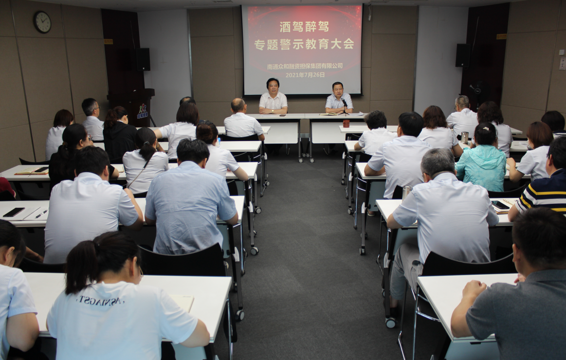 為深入貫徹落實產(chǎn)控集團關于開展“酒駕醉駕專題警示教育”通知要求,進一步強化酒后駕車警示教育,有效預防和堅決遏制公司干部職工酒駕醉駕等違法違紀行為的發(fā)生,7月26日上午,南通眾和融資擔保集團有限公司召開酒駕醉駕專題警示教育大會,本部全體干部職工、子公司中層以上干部近60人參加會議,黨支部書記何葉主持會議。